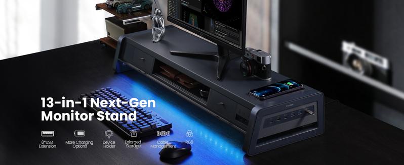 - Fast Charging & Seamless Connectivity: The Dual Monitor Stand features 8 USB ports (4 for fast charging, 4 for data transfer) and a 15W wireless charging pad, keeping your devices powered and connected. Effortlessly charge smartphones, USB drives, iPads, Kindles, and more—right within reach to boost your productivity
