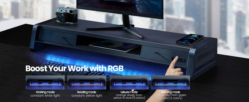 - 13 in One Dual Monitor Stand Riser: Vaydeer multifunctional stand featuring a dual monitor riser, wireless charging pad, 8 USB ports (4 fast charging, 4 data transfer), LED light strip, and storage drawers. Made from durable metal, it supports up to 50kg, helping you stay organized while reducing eye and neck strain for a more efficient workspace,